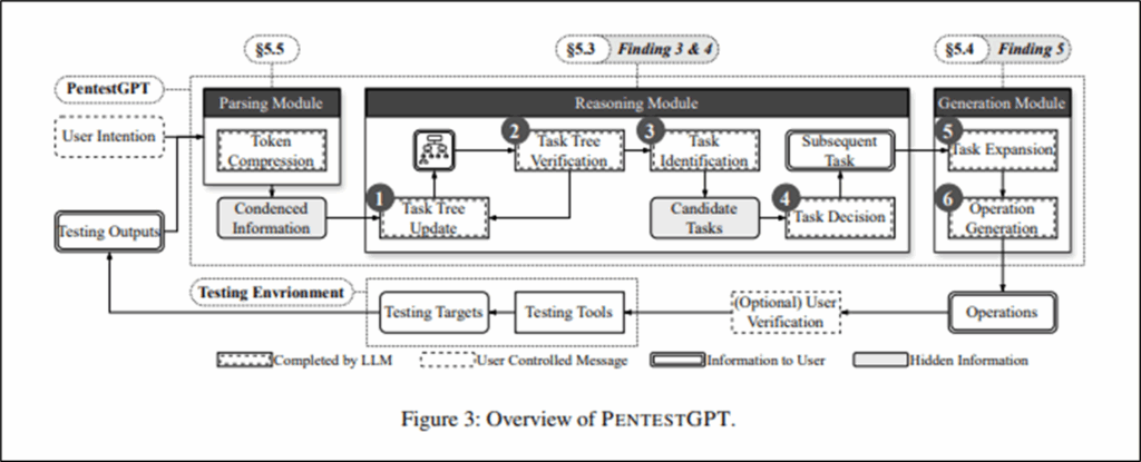 - El primero en el año 2023, cuando unos investigadores de la Universidad Tecnológica de Nangyang en Singapur, Alias Robotics y otras instituciones de renombre, deciden aprovechar las capacidades de la IA en el campo del pentest. Para ello, crean PentestGPT, un framework de pentesting automatizado que utiliza LLMs. El paper «PENTESTGPT: Evaluating and Harnessing Large Language Models for Automated Penetration Testing» presentado en Junio del 2024, serviría como ancla para muchas de las investigaciones que sucederían después.