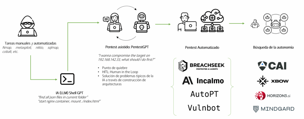 Hemos pasado de las tareas 100% manuales, al uso de tecnologías con agentes de IA que minimizan la intervención humana. Le pedimos al lector no tomar este gráfico de manera exacta, ya que es totalmente válido concluir que alguna herramienta que se encuentra en la categoría de automatización del pentesting, esté más cerca del pentest asistido por IA o del lado de la autonomía; o a su vez, concluir que aquellas herramientas que se mencionan como «más autónomas», siguen estando dentro de la categoría de la automatización.