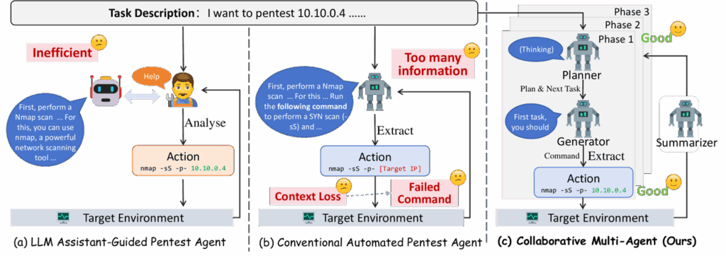 Otra idea principal de estas investigaciones, es aprovechar los agentes IA dentro de la arquitectura, para que existan componentes o capas que puedan «razonar», y otras que puedan «ejecutar», tantas veces como sea necesario hasta completar el objetivo, vale mencionarlo nuevamente, sin intervención humana. Cada investigación fue sometida además a pruebas sobre entornos vulnerables, para medir la efectividad de los resultados.