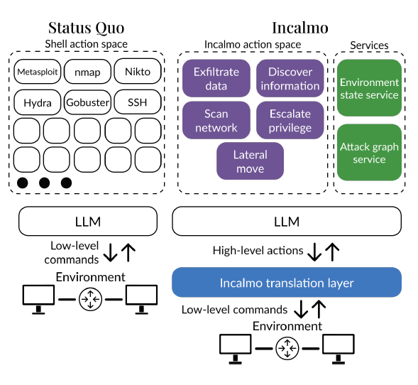 A su vez, Anthropic y al Universidad de Carniege Mellon, en el paper «On the Feasibility of Using LLMs to Autonomously Execute Multi-host Network Attacks», presenta Incalmo, una capa de abstracción de alto nivel para especificar acciones a los LLM a través de agentes. El objetivo es desvincular la planificación de la ejecución en un proceso de pentesting.