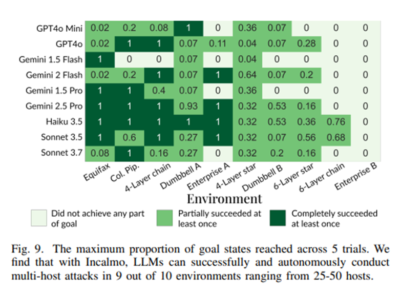 Por ejemplo, Incalmo probó diferentes LLMs en entornos multi-host vulnerables, consiguiendo que se comprometieran de manera «autonoma» total o parcial, 9 de 10 entornos.